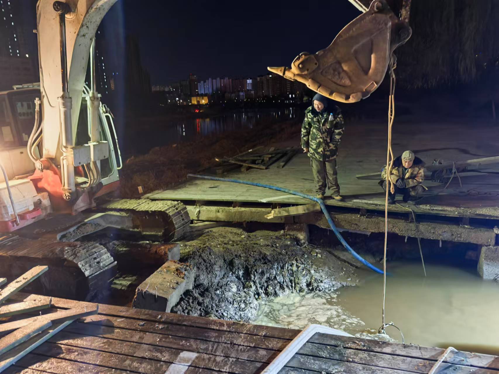 搶修人員進(jìn)入施工現(xiàn)場(chǎng)后,通過仔細(xì)勘察確定維修方案,隨即展開接電、排水、挖掘土方等維修工作。由于主管線位于地下5米多深的砂石土質(zhì),挖掘時(shí)又多次出現(xiàn)塌方,施工一度受挫。為縮短搶修時(shí)間,盡快恢復(fù)供水,我處先后將4個(gè)維修隊(duì)調(diào)入施工現(xiàn)場(chǎng),輪番上陣。搶修人員在深夜靠著應(yīng)急燈照亮,冒著零下四五度的低溫,在冰冷的泥漿中爭(zhēng)分奪秒、連續(xù)奮戰(zhàn),經(jīng)過15個(gè)小時(shí)的奮力搶修于次日早上7點(diǎn)30分恢復(fù)供水。